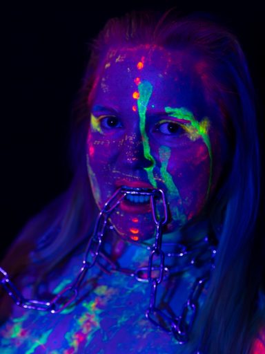 Bilder im Studio unter Schwarzlicht mit gemalten Highlights / Mustern / Masken aus fluoreszierender Bodypaintfarbe. (Die zu bemalenden Körperteile wählt Ihr selbst)*